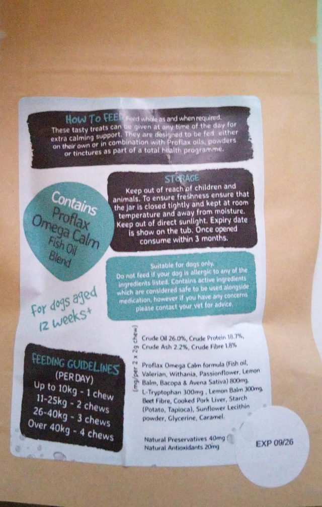 ​These soft, tasty chews are fast-acting, starting to work in just 30 minutes! They contain a powerful blend of 20% Omega Calm oil, L-Tryptophan, and Lemon Balm to help: